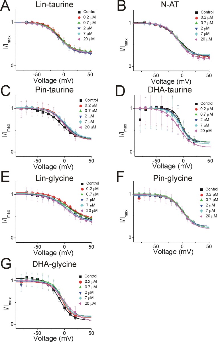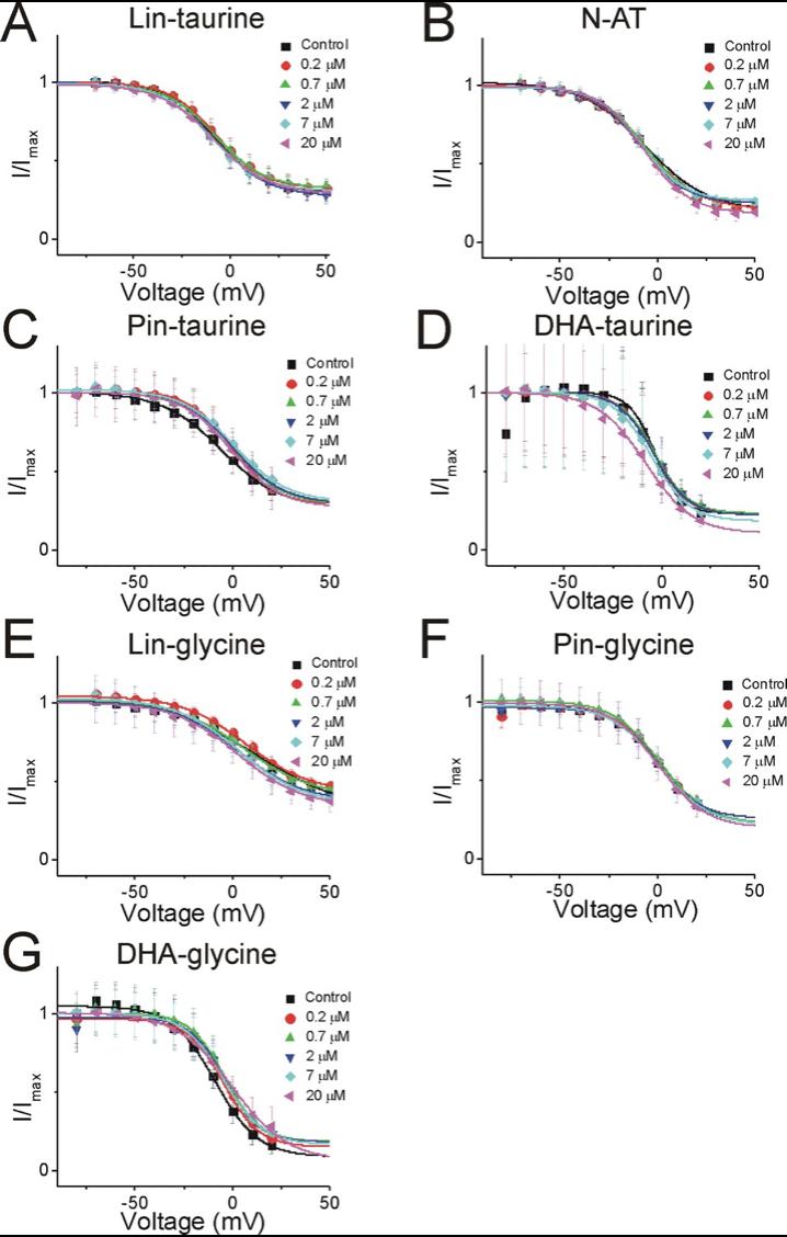 Supplementary figure 7- Internally normalized steady state inactivation curves for Nav1.5/β1. (AâG) PUFA-induced effects on Nav1.5/β1 voltage dependent inactivation normalized by each concentration for: (A) Lin-taurine, (B) N-AT, (C) Pin-taurine, (D) DHA-taurine, (E) Lin-glycine, (F) Pin-glycine, and (G) DHA-glycine. |