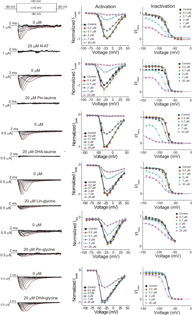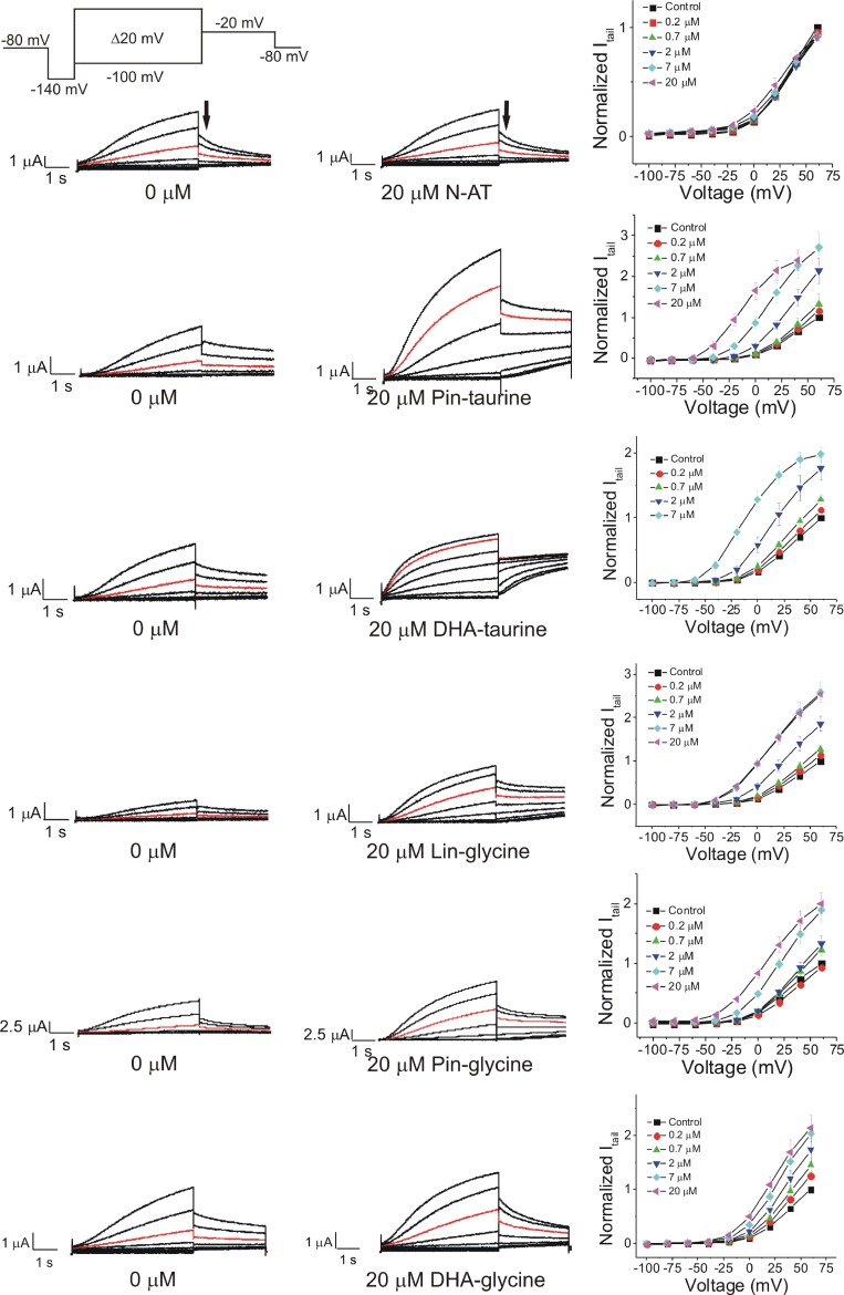 Figure 6. Dose response curves for PUFAs on IKs, ICaL, and INaV at 0 mV.Dose response of IKs, ICaL, and INaV currents (I/I0) at 0 mV for (A) Lin-taurine (Km of IKs = 11.4 ± 0.4 μM; Km of ICaL = 1.4 ± 0.4 μM; Km of INaV = 2.4 ± 0.04 μM; mean ± SEM), (B) N-AT (Km of IKs = NA; Km of ICaL = 2.5 ± 1.9 μM; Km of INaV = 3.1 ± 0.3 μM; mean ± SEM), (C) Pin-taurine (Km of IKs = 4.5 ± 0.2 μM; Km of ICaL = NA; Km of INaV = 5.8 ± 1.7 μM; mean ± SEM), (D) DHA-taurine (Km of IKs = 5.9 ± 0.3 μM; Km of ICaL >20 μM; Km of INaV = 2.3 ± 0.1 μM; mean ± SEM), (E) Lin-glycine (Km of IKs = 5.4 ± 0.2 μM; Km of ICaL = NA; Km of INaV = 5.6 ± 0.5 μM; mean ± SEM), (F) Pin-glycine (Km of IKs > 20 μM; Km of ICaL = NA; Km of INaV >20 μM; mean ± SEM), and (G) DHA-glycine (Km of IKs > 20 μM; Km of ICaL = NA; Km of INaV >20 μM; mean ± SEM),. |