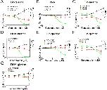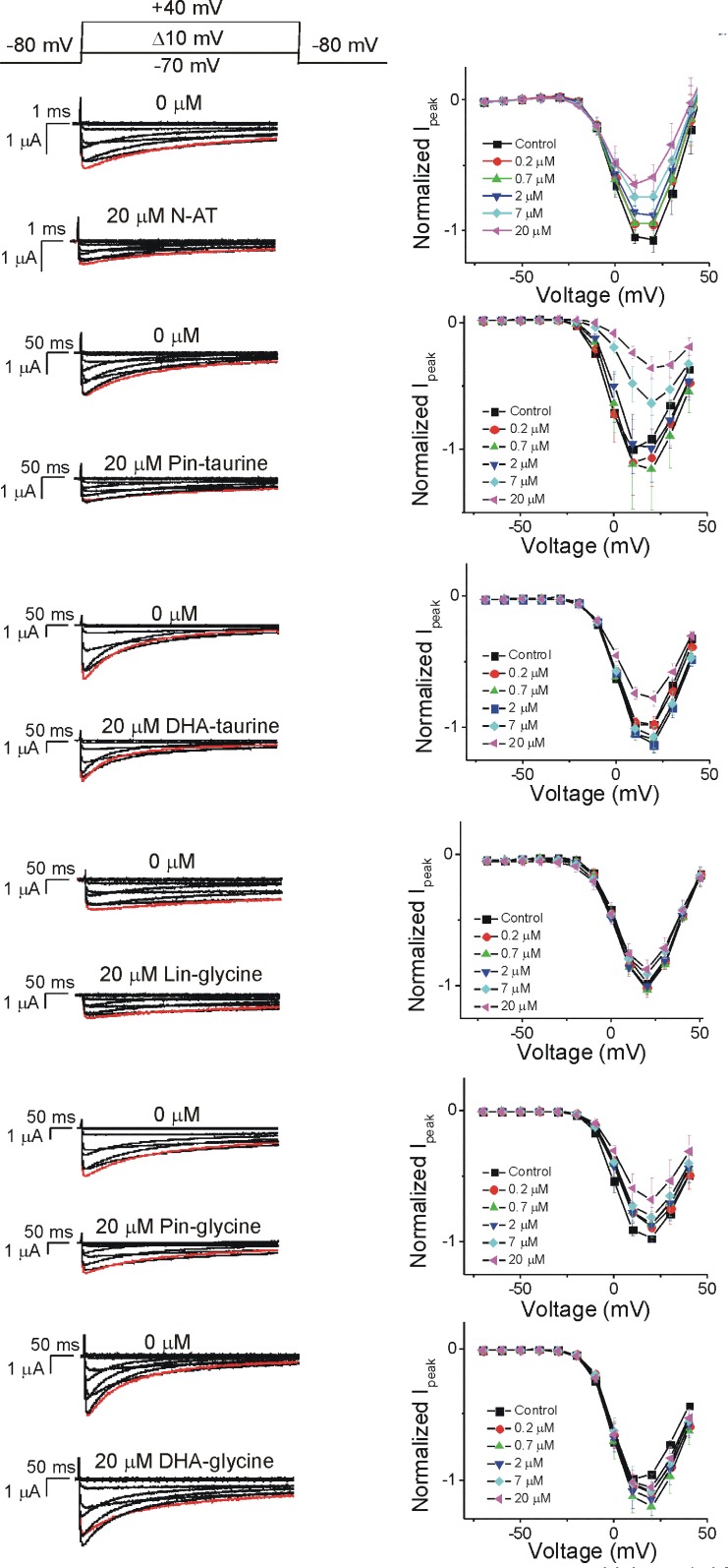 Figure 6- Dose response curves for PUFAs on IKs, ICaL, and INaV at 0 mV. Dose response of IKs, ICaL, and INaV currents (I/I0) at 0 mV for (A) Lin-taurine (Km of IKs = 11.4 ± 0.4 μM; Km of ICaL = 1.4 ± 0.4 μM; Km of INaV = 2.4 ± 0.04 μM; mean ± SEM), (B) N-AT (Km of IKs = NA; Km of ICaL = 2.5 ± 1.9 μM; Km of INaV = 3.1 ± 0.3 μM; mean ± SEM), (C) Pin-taurine (Km of IKs = 4.5 ± 0.2 μM; Km of ICaL = NA; Km of INaV = 5.8 ± 1.7 μM; mean ± SEM), (D) DHA-taurine (Km of IKs = 5.9 ± 0.3 μM; Km of ICaL >20 μM; Km of INaV = 2.3 ± 0.1 μM; mean ± SEM), (E) Lin-glycine (Km of IKs = 5.4 ± 0.2 μM; Km of ICaL = NA; Km of INaV = 5.6 ± 0.5 μM; mean ± SEM), (F) Pin-glycine (Km of IKs > 20 μM; Km of ICaL = NA; Km of INaV >20 μM; mean ± SEM), and (G) DHA-glycine (Km of IKs > 20 μM; Km of ICaL = NA; Km of INaV >20 μM; mean ± SEM),. |