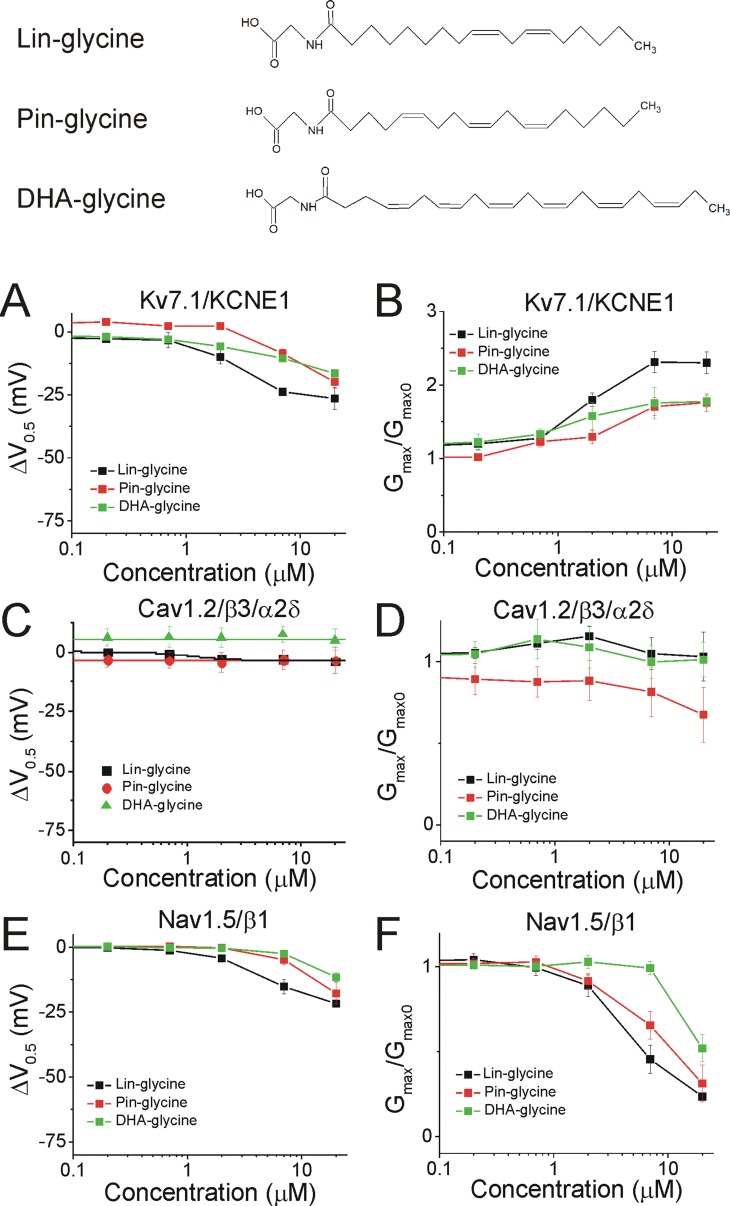 Figure 5- PUFA analogues with glycine head groups tend to be more selective for Kv7.1/KCNE1 than Cav1.2/β3/α2δ and Nav1.5/β1 channels. Structures for PUFA analogues with glycine head group: Lin-glycine, Pin-glycine, and DHA-glycine (top). (AâB) Dose dependent shifts in the (A) voltage dependence of activation (ÎV0.5) and (B) changes in maximal conductance (Gmax) for Kv7.1/KCNE1 induced by Lin-glycine (black squares; n = 4; mean ± SEM), Pin-glycine (red circles; n = 3; mean ± SEM), and DHA-glycine (green triangles; n = 4; mean ± SEM). (CâD) Dose dependent shifts in the (C) voltage dependence of inactivation (ÎV0.5) and (D) changes in maximal conductance (Gmax) for Cav1.2/β3/α2δ induced by Lin-glycine (black squares; n = 4; mean ± SEM), Pin-glycine (red circles; n = 3; mean ± SEM), and DHA-glycine (green triangles; n = 3; mean ± SEM). (EâF) Dose dependent shifts in the (E) voltage dependence of inactivation (ÎV0.5) and (F) changes in maximal conductance (Gmax) for Nav1.5/β1 induced by Lin-glycine (black squares; n = 4; mean ± SEM), Pin-glycine (red circles; n = 4; mean ± SEM), and DHA-glycine (green triangles; n = 7; mean ± SEM). See Figure 4âfigure supplements 1â6 for more details. |
