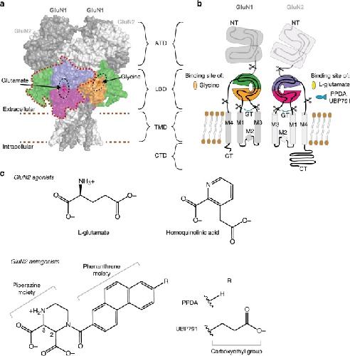 Fig. 1. NMDAR domain organization and ligands.a GluN1/GluN2 form tetrameric receptors with two GluN1 (dark gray) and two GluN2 (light gray) subunits. Each subunit has an ATD, LBD, TMD, and CTD domain (CTD not included). The LBD layer contains a dimer of GluN1âGluN2 heterodimers, one of which is highlighted by a surrounding red dashed line. The GluN1 upper lobe (D1) and lower lobe (D2) are colored in green and orange, and the GluN2 D1 and D2 in purple and magenta. The surface presentation is produced from the PDB structure 4PE5. b Schematic representation of GluN1 and GluN2 subunits. Glycine, l-glutamate, and competitive antagonists bind in the LBD clefts. The modular build of the subunits allows isolation of the GluN1 and GluN2A LBDs by replacing the M1âM3 transmembrane sequence with a Gly-Thr dipeptide linker. Color coding as in (a). c Chemical structures of GluN2 agonists L-glutamate and homoquinolinic acid and antagonists PPDA and UBP791 at pH ~7. PPDA and UBP791 are cis-racemic mixtures of (2S,3R)- and (2R,3S)-isomers. |