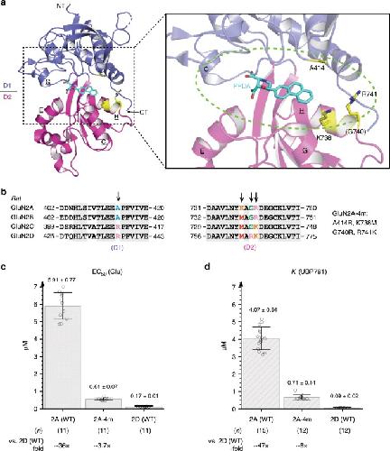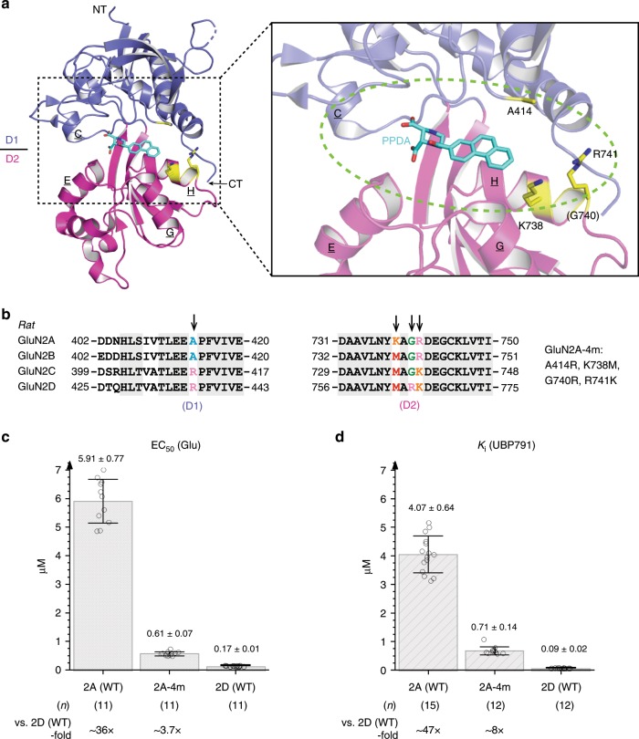 Fig. 3. Site-directed mutagenesis of GluN2A binding pocket and its effect on l-glutamate and UBP791 sensitivity.a, b The GluN2A LBD of the GluN1âGluN2A LBD crystal structure complexed to PPDA (cyan sticks; PDB code: 4NF6) colored as in Fig. 1. Residues within the ligand-binding pocket (green dashed oval) which are not conserved among GluN2A-D in the sequence alignment (panel b arrows) are shown in yellow. Four mutations (Ala414Arg, Lys738Met, Gly740Arg, Arg741Lys) were introduced in GluN2A to generate GluN2A-4m. c EC50 values for l-glutamate and d Ki values for UBP791 for GluN1-4a/GluN2A-4m were obtained by TEVC. Dose-response for UBP791 was measured in the presence of 100âμM glycine and 1âμM l-glutamate with varying UBP791 concentrations (Supplementary Fig. 2). Single data points are shown as open circles, the bar graph represents the mean with error bars for s.d., and the number of recordings (n) and the fold-difference to EC50 and Ki of GluN2D are as shown. Pairwise comparison shows subtypes have different potencies (pâ<â0.0001 with two-tail t-test and Bonferroni correction). |