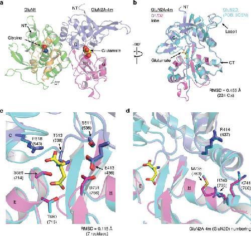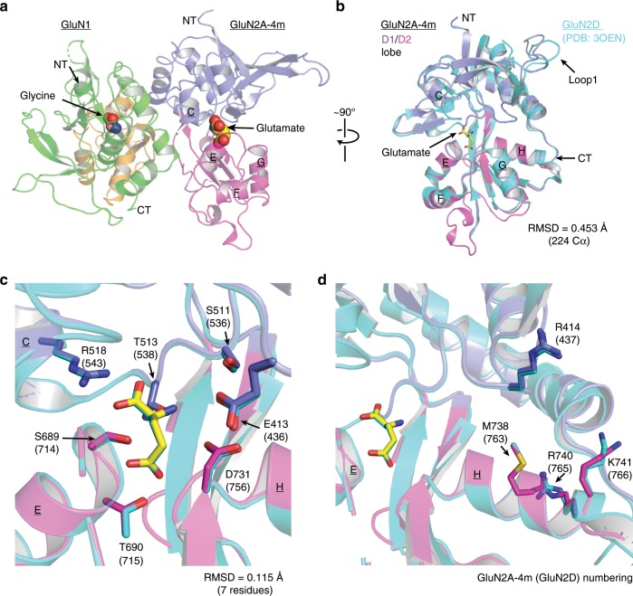 Fig. 4. Crystal structure of GluN1–GluN2A-4m LBD and comparison with GluN2D LBD.a Crystal structure of the GluN1–GluN2A-4m LBD heterodimer in complex with glycine (orange sphere) and l-glutamate (yellow sphere). Helices are labeled with underlined letters and the color coding is in accordance to Fig. 1. b Structures of the GluN2A-4m LBD and the GluN2D LBD (PDB: 3OEN) can be superposed with one another at an RMSD of 0.45 Å over 224 Cα positions. c Comparison of the l-glutamate-binding sites of GluN2D and GluN2A-4m shows the similar mode of ligand-receptor interactions. Residue numbering shown for GluN2A-4m and GluN2D (in brackets). d Mutated residues in GluN2A-4m overlap well with the equivalent residues in GluN2D with minor differences in side chain orientations. |