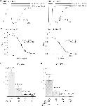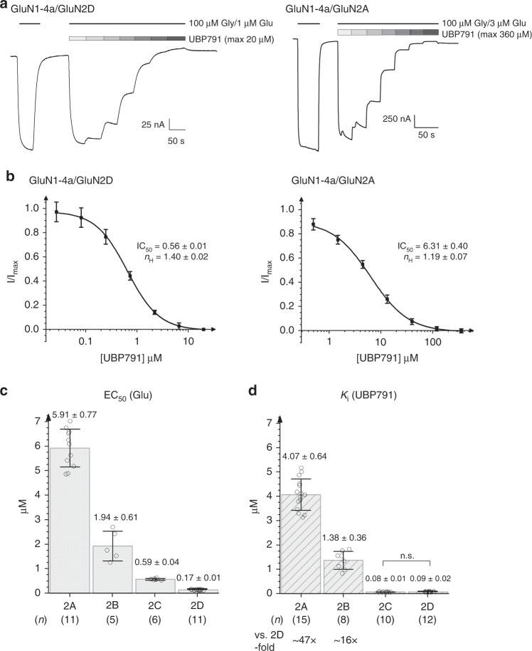 Fig. 2. UBP791 binds preferentially to GluN2C/2D-containing NMDARs over GluN2A/2B-containing NMDARs.a Representative TEVC dose-response traces of GluN1-4a/GluN2D (left panel) or GluN1-4a/GluN2A (right panel) NMDARs held at â60âmV. Currents were evoked by application of 100âμM glycine and 1 or 3âμM l-glutamate and inhibited by varying concentrations of UBP791 (threefold increments to max. 20 and 360âμM as shown). b Averaged dose-response curves (meanâ±âs.d.) for inhibition with UBP791 from ten GluN1-4a/GluN2D and 15 GluN1-4a/GluN2A recordings fit with the Hill equation to calculate IC50 and Hill coefficient (nH). c EC50 values for GluN1-4a/GluN2 (aâd) obtained from l-glutamate dose-response curves. d Inhibition potency (Ki) values calculated using the ChengâPrusoff equation with the determined EC50 and IC50 values. Single data points are shown as open circles, the bar graph represents the mean with error bars for s.d., the number of recordings (n) and the fold difference to the Ki of GluN2D are as shown. Pairwise comparison shows subtypes have different potencies (pâ<â0.05 with two-tail t test and Bonferroni correction) except where stated (n.s.). |