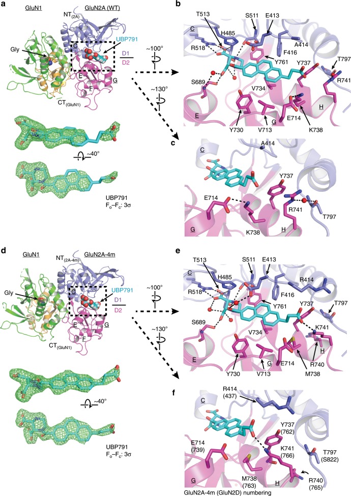Fig. 5. Structures of glycine/UBP791 complexed to GluN1–GluN2A (WT) and GluN1–GluN2A-4m LBD.a Overall structure of the GluN1–GluN2A LBD complexed to glycine (orange spheres) and UBP791 (cyan spheres) colored as in Fig. 1. Shown in mesh below is the Fo − Fc omit map of UBP791 contoured at 3σ. b, c The binding site of UBP791 (cyan sticks) showing polar (dashed lines) and hydrophobic interactions. GluN2A-Lys738 and -Glu714 form a hydrogen bond whereas GluN2A-Arg741 and –Thr797 form a water-mediated hydrogen bond. d Overall structure of the GluN1–GluN2A-4m LBD complexed to glycine (orange spheres) and UBP791 (cyan spheres). Note that the Fo − Fc omit map of UBP791 contoured at 3σ (green mesh) here is more ordered and continuous compared with that in the GluN1–GluN2A LBD in a. e The binding site of UBP791 (cyan sticks) showing similar polar (dashed lines) and hydrophobic interactions with the piperazine and phenanthrene moieties to those in the GluN1–GluN2A LBD in a. f In contrast to the GluN1–GluN2A LBD, GluN2A-4m-Met738 forms sulfur-aromatic interactions with the ligand and Tyr737, while GluN2A-4m-Lys741 forms a hydrogen bond with the carboxyethyl group of UBP791. |