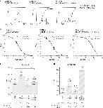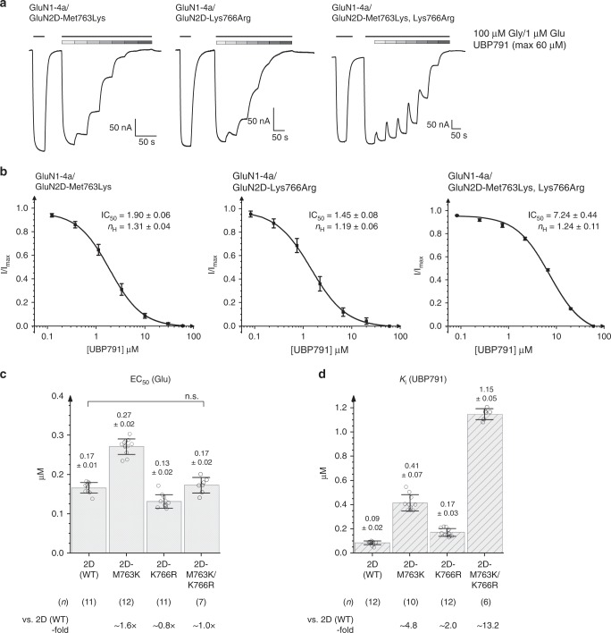 Fig. 6. Effect of mutations in GluN2D on l-glutamate and UBP791 sensitivity.a Representative TEVC dose-response traces of single mutant GluN1-4a/GluN2D Met763Lys (left panel), Lys766Arg (middle panel) or double mutant Met763Lys/Lys766Arg (right panel) NMDARs held at â60âmV. Currents were evoked by application of 100âμM glycine and 1âμM l-glutamate and inhibited by varying concentrations of UBP791 (Met763Lys: concentration increments: 0.12/0.37/1.1/3.3/10/30/60âμM; for Lys766Arg and double mutant: three-fold increments from 0.08â60âμM). b Averaged dose-response curves (meanâ±âs.d.) for inhibition with UBP791 from eight, twelve, and six recordings for GluN1-4a/GluN2D Met763Lys, GluN1-4a/GluN2D Lys766Arg, and GluN1-4a/GluN2D Met763Lys/Lys766Arg, respectively, fit with the Hill equation to calculate IC50 and Hill coefficient (nH). c EC50 for l-glutamate and d Ki for UBP791 for the mutants were obtained by TEVC recordings as in Fig. 2. Single data points are shown as open circles, the bar graph represents the mean with error bars for s.d., the number of recordings (n) and the fold-difference to EC50 and Ki of GluN2D (WT) are as shown. Pairwise comparison shows WT and mutants have different potencies (pâ<â0.05 with two-tail t-test and Bonferroni correction) except where stated (n.s.). |