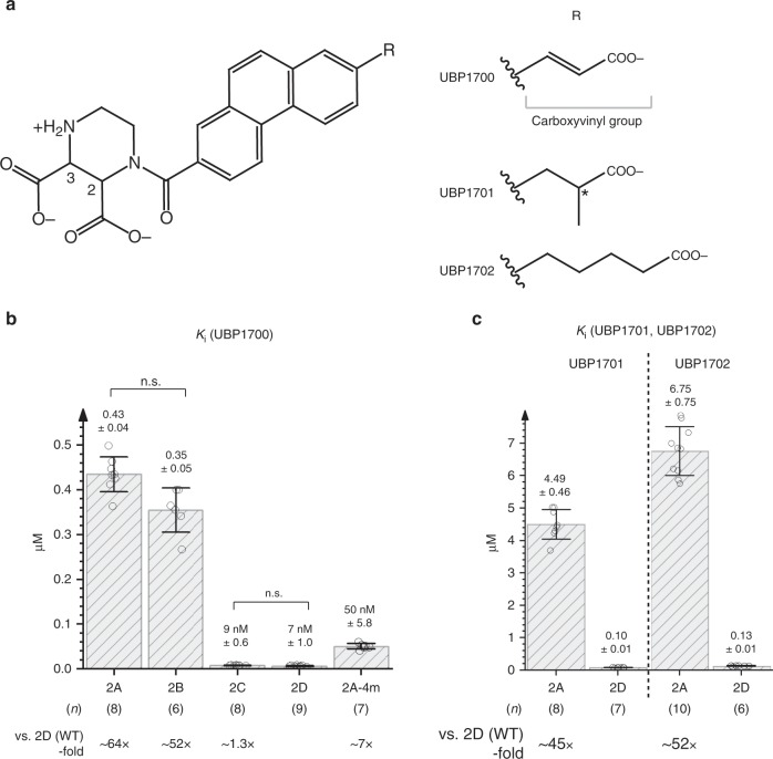 Fig. 7. Designed compounds with increased GluN2C/2D selectivity and potency.a UBP1700, 1701, and 1702 have carboxylate moieties of different length, bulkiness, and rigidity. The chiral center in the R-group of UBP1701 is marked with an asterisk. At physiological pH the amine group of the piperazine ring is protonated and therefore positively charged and the three carboxylic acid groups are negatively charged. b Ki values for UBP1700 inhibition were measured on GluN1-4a/GluN2 (aâd) NMDARs and GluN1-4a/GluN2A-4m NMDAR as described in Fig. 2. Inhibition dose-response was observed in the presence of 100âμM glycine, 1 or 3âμM l-glutamate, and varying concentrations of UBP1700 (Supplementary Fig. 4). Pairwise comparison shows subtypes have different potencies (pâ<â0.05 with two-tail t-test and Bonferroni correction) except where stated (n.s.). c Potencies of UBP1701 and UBP1702 on GluN1-4a/GluN2A and GluN1-4a/GluN2D were obtained as in Fig. 2. |