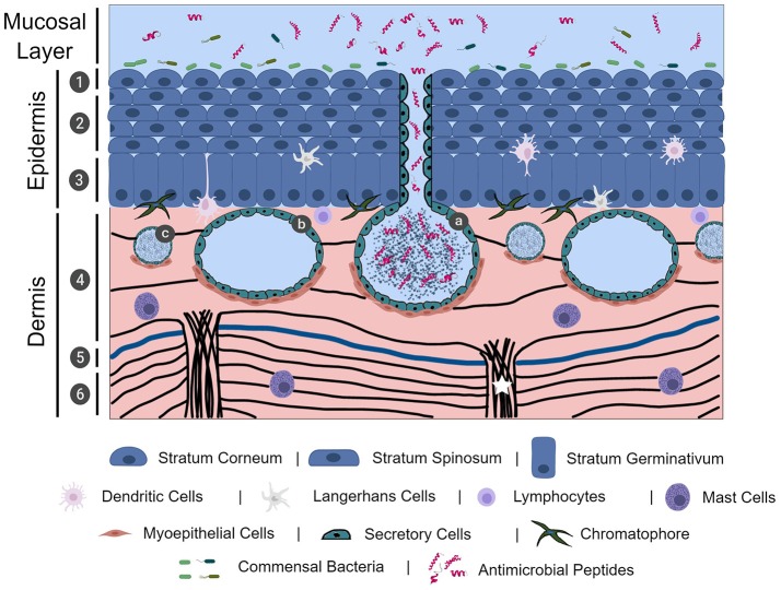 Figure 1. The physical, chemical, cellular, and microbiological innate immune barriers of frog skin. Frog skin, which is mucosal in nature, contains physical, chemical, cellular, and microbiological barriers that work together in defence against pathogen assault. Frog skin is composed of an epidermal and dermal layer, containing resident immune cells throughout the layers. The epidermis is comprised of stratified squamous epithelial cells in three distinct layers: the stratum corneum (1), stratum spinosum (2), and stratum germinativum. The dermis is largely comprised of connective tissue formed by collagenous fibres (black lines) in two layers, the spongious dermis (4) and the compact dermis (6), connected by collagenous columns (white star). In mainly terrestrial frogs, the Eberth-Kastschenko layer (5, thick blue line) separates the spongious dermal layer and compact dermal layer. Glands within the dermal layer include granular glands (a), mucosal glands (b), and small mixed glands (c) that secrete a slew of compounds, including mucus and antimicrobial peptides. Commensal bacteria overlay the frog skin layers, forming the microbiological barrier. The image was, in part, created with the aid of BioRender. |