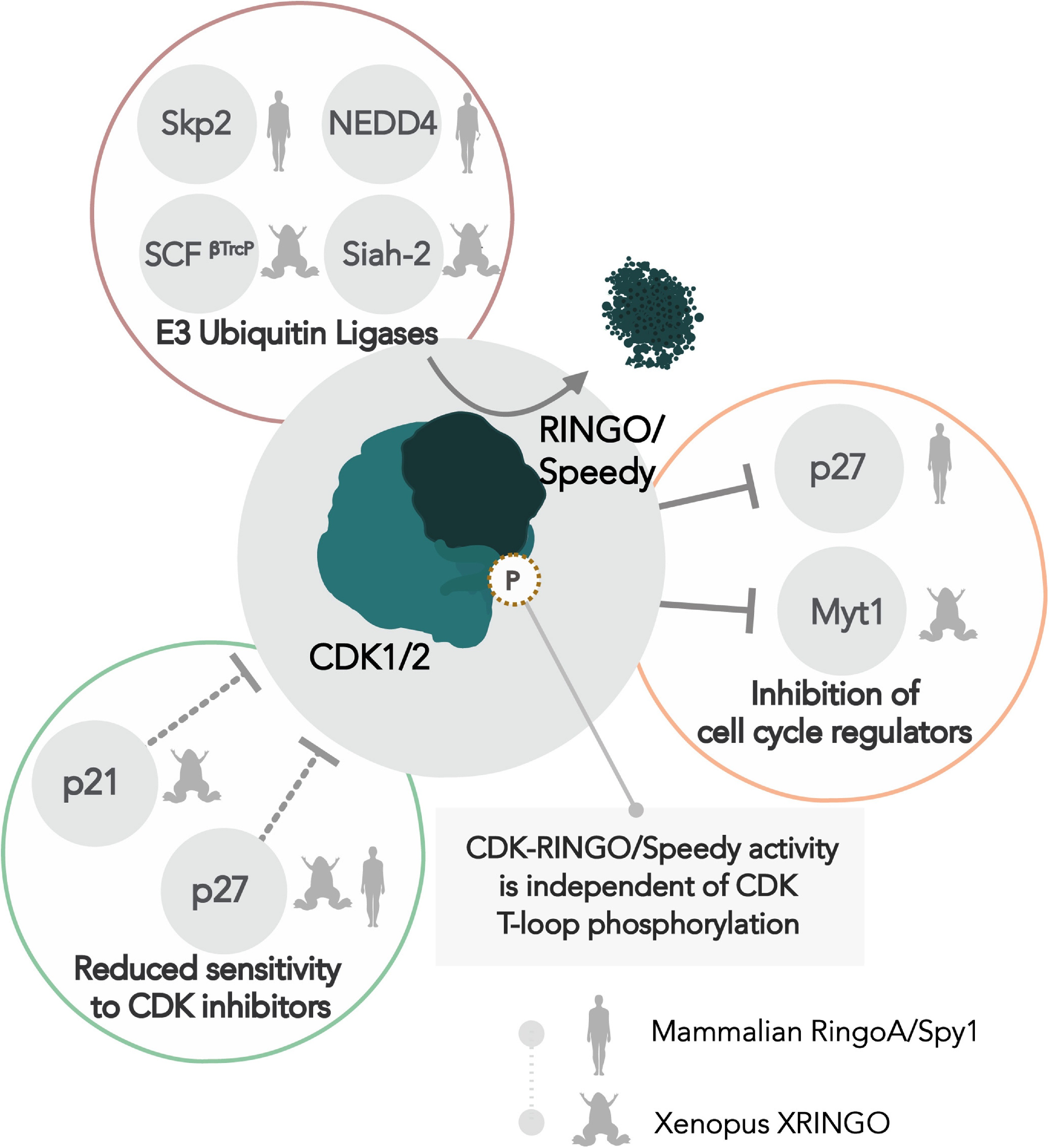 Cyclin-dependent kinases (CDKs) require the binding to a regulatory subunit to acquire enzymatic activity, and cyclins are the canonical CDK activators. However, there are specific situations in which CDKs can be activated by non-cyclin proteins that are less characterized. This review focuses on the family of RINGO/Speedy proteins, which have no sequence amino acid homology to cyclins but can bind to and activate CDK1 and CDK2. Interestingly, RINGO/Speedy proteins can activate CDKs under conditions in which CDK-cyclin complexes would not be active, and there is evidence that RINGO/Speedy-activated CDKs can phosphorylate different sites than the cyclin-activated CDKs. RINGO/Speedy proteins were originally described in Xenopus oocytes, but their roles in mammalian cells have also been addressed. We will summarize the properties of RINGO/Speedy proteins and how they trigger CDK activation, and discuss recent studies that characterized their physiological functions. In particular, studies using genetically modified mice have shown that RingoA, also known as Spy1, plays a key role in meiosis regulation. Emerging evidence also suggests a potential role for RingoA/Spy1 in cancer.