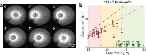 Figure 1—figure supplement 1. Contraction center localization and centering dynamics are not dependent on microtubules.Aggregate positions and recentering dynamics were measured in droplets supplemented with 33 μM Nocodazole, which disrupts microtubule assembly. (a) Spinning-disk confocal images from a timelapse movie showing the recentering of the contraction center following a magnetic perturbation in a droplet with Nocodazole-treated extract. The actin network is labeled with GFP-Lifeact. (b) The position of the aggregate surrounding the contraction center was determined for a population of droplets formed with Nocodazole-treated extract. The displacement of the aggregate from the center is plotted as a function of droplet radius for unperturbed droplets. The colored regions depict the different size ranges: small droplets that are primarily polar (red), intermediate range with both polar and symmetric droplets (yellow), and large droplets which are mostly centered (green). The centering dynamics and localization distribution are similar to the untreated condition (Figures 1 and 3). |