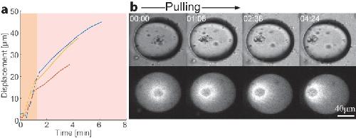 Figure 3—figure supplement 2. Transition to a polar state following a magnetic perturbation.During the magnetic pulling experiments, 5 out of 31 droplets broke symmetry following the perturbation. (a) The position of the aggregates in three droplets that broke symmetry after the perturbation are plotted as a function of time. The dashed lines depict the pulling phase, while the solid lines depict the dynamics after the magnet was removed. (b) Bright-field and spinning-disk confocal images of the actin network labeled with GFP-Lifeact from a time lapse movie of a droplet which became polar after the magnetic perturbation (Video 5). |