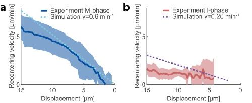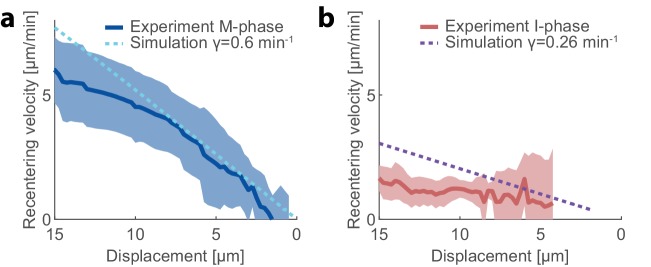 Figure 4—figure supplement 2. Aggregate recentering velocity in M-phase and I-phase extracts.(a,b) The aggregate recentering velocity is depicted as a function of the displacement from the droplet center. The experimental results from magnetic pulling experiment are shown for (a) standard M-phase extracts (blue line; mean ± STD; Figures 3e and 4h) and (b) I-phase extracts (red line; mean ± STD; Figure 4k). The experimental data are compared to the results of simulations in M-phase or I-phase extracts (dashed lines), respectively. The observed contraction rates in M-phase and I-phase extracts (Figure 4j) are used as inputs for the respective simulations with no additional fit parameters. |