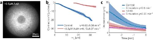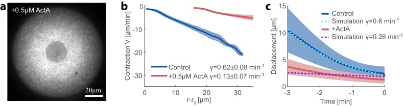 Figure 4âfigure supplement 3. Recentering dynamics in ActA-supplemented extract.(a) Spinning-disk confocal image of the equatorial cross section in droplets supplemented with 0.5 μM ActA. The actin network is labeled with GFP-Lifeact. (b) Network contraction velocity measured as a function of distance from the inner network boundary, for control and ActA supplemented extracts (mean ± STD). The contraction rate, γ, is determined from the slopes of linear fits to the data (c) The simulation predictions for the displacement of the aggregate as a function of time (dashed lines) are compared to the average displacement determined experimentally in control and ActA supplemented extracts (solid line; mean ± STD). |
