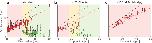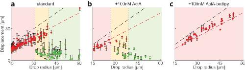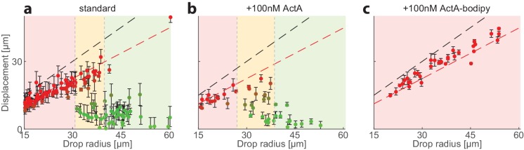Figure 5—figure supplement 1. Size-dependent localization of the contraction center is not influenced by low levels of bulk ActA.The position of the aggregate surrounding the contraction center was determined for a population of droplets formed with 80% extract (standard; left), and samples supplemented with 100 nM ActA in bulk (center) or 100 nM ActA-Bodipy which localizes at the interface. The displacement of the aggregate from the center is plotted as a function of droplet radius. The colored regions depict the different size ranges: small droplets that are primarily polar (red), intermediate range with both polar and symmetric droplets (yellow), and large droplets which are mostly centered (green). The dashed black line marks the droplet radius, and the dashed red line marks the displacement where the aggregate reaches the boundary (droplet radius minus aggregate radius). While the addition of 100 nM ActA-Bodipy at the interface leads to complete symmetry breaking (right), the same concentration of ActA in bulk does not have a significant effect on the size-dependent localization pattern (center). |