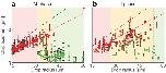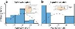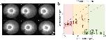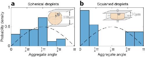 Figure 5—figure supplement 2. Sample geometry induces anisotropy in the localization of the aggregate in the polar state.The angular distribution of the position of polar aggregates was determined for (a) a population of spherical droplets (100 µm chamber height), and (b) a population of pancake-shaped droplets, squished in a 30 µm-high chamber. The measured angular probability-density histograms are plotted together with the angular distribution predicted for an isotropic process (dashed line). In spherical droplets, the measured angular distribution is broad, whereas in squished droplets there is an obvious preference to break symmetry toward the top and bottom interface. Both squished and spherical droplets exhibit a slight upwards bias, (toward θ = 0), implying that the aggregate is likely buoyant relative to the surrounding fluid. |