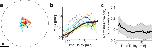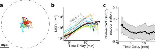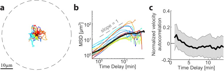 Figure 2—figure supplement 1. Analysis of the dynamics of aggregate position as a function of time in droplets before symmetry breaking.(a) The position of the aggregate in different droplets that eventually break symmetry was followed (as shown in Figure 2b). Tracks of the aggregates position are depicted during the initial period in which the aggregates remained nearly centered (i.e. for t < 0 in Figure 2b; N = 17). (b) The mean squared displacement of the aggregate position in different droplet is shown as a function of time. Thick gray line – mean MSD of droplets that remain centered for over an hour as shown in Figure 2d. The aggregates exhibit confined random fluctuations before breaking symmetry, similar to the dynamics of aggregates in centered droplets (Figure 2d). (c) The normalized velocity autocorrelation (mean ± STD; N = 17, averaged for the different droplets) is shown for the tracks on the left. The velocity is considerably less correlated over time than during the symmetry breaking phase (Figure 2h). |