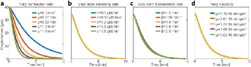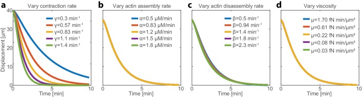 Figure 4—figure supplement 1. The network contraction rate is the main control parameter for the hydrodynamic centering mechanism.The sensitivity of the hydrodynamic centering mechanism to the characteristics of the actin meshwork and the fluid cytosol was evaluated by numerical simulations of the recentering dynamics, performed using different network and fluid parameters. (a-d) The simulation results for the contraction center displacement as a function of time following a magnetic perturbation are shown. The simulations were performed with the following parameter values R = 50 μm; α = 1 μM/min; β = 1.43 min−1; γ = 0.67 min−1; μ = 1.7 fN min/μm2, except for the parameter varied in each graph as indicated. The network contraction rate is the main control parameter for the recentering mechanism. The recentering dynamics are considerably faster with higher network contraction rates (a), whereas the network assembly (c) and disassembly rates (d), and the fluid viscosity (b), have little influence on the recentering dynamics. |