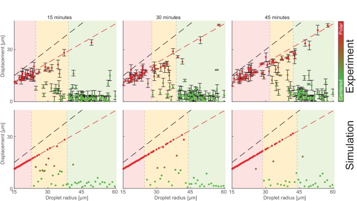 Figure 1—figure supplement 2. Size-dependent localization of the contraction center as a function of time.The position of the aggregate surrounding the contraction center was determined for a population of droplets of different sizes, 15 min (left), 30 min (center) or 45 min (right) after sample preparation. The displacement of the aggregate from the center is plotted as a function of droplet radius based on the experimental data (top) and the simulation (bottom; see Appendix 2). The colored regions depict the different size ranges: small droplets that are primarily polar (red), intermediate range with both polar and symmetric droplets (yellow), and large droplets which are mostly centered (green). The dashed black line marks the droplet radius, and the dashed red line marks the displacement where the aggregate reaches the boundary (droplet radius minus aggregate radius). The centered state is metastable, with larger droplets becoming polar over time. |
