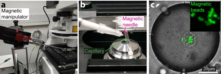 Figure 3—figure supplement 1. Magnetic pulling experimental setup.(a) Image of the manipulator with the magnetic needle mounted on the inverted microscope. (b) Image of the magnetic needle near the sample placed in a rectangular capillary. (c) Bright field image overlaid with a spinning disk confocal image of a droplet containing fluorescent beads. Fluorescent beads were used only for demonstration; during the experiments non-fluorescent, magnetic beads were used. Inset. Zoomed confocal image of the fluorescent beads localized in the aggregate. |