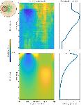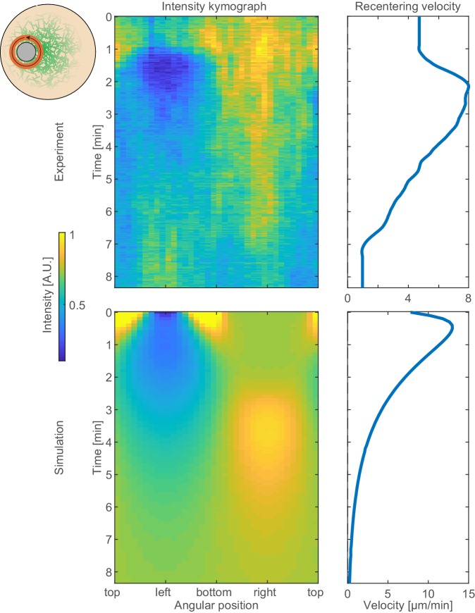 Figure 3âfigure supplement 3. Asymmetric actin network distribution during recentering.Left: A kymograph showing the angular distribution of the actin network density around the aggregate (x-axis; scheme on the left) as a function of time (y-axis) during the magnetic perturbation experiments (top) and their simulation (bottom). Right: Graphs depicting the recentering velocity as a function of time during the magnetic perturbation experiments (top) and their simulation (bottom). The correlation between the asymmetry in the actin network distribution around the aggregate and the recentering velocity is evident both in the experiments and in the simulations. |