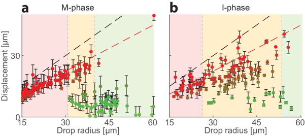 Figure 4—figure supplement 4. Cell-cycle dependence of the localization of the contraction center.The localization pattern in I-phase extract, which exhibits weak contraction (Field et al., 2011), is characterized by less centered droplets and more symmetry breaking compared to M-phase extract. The position of the aggregate surrounding the contraction center was determined for a population of droplets formed with M-phase extract (left) or I-phase extract (right). The displacement of the aggregate from the center is plotted as a function of droplet radius. The colored regions depict the different size ranges: small droplets that are primarily polar (red), intermediate range with both polar and symmetric droplets (yellow), and large droplets which are mostly centered (green). The dashed black line marks the droplet radius, and the dashed red line marks the displacement where the aggregate reaches the boundary (droplet radius minus aggregate radius). I-phase droplets are more likely to be polar, even at large droplet sizes that remain centered in M-phase. |