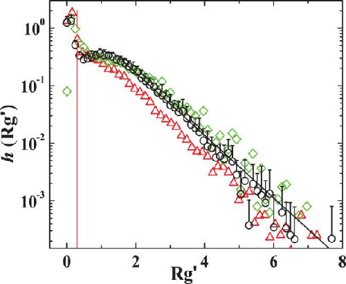 FIGURE 3:. Measured PDF (normalized histogram) h(Rgâ²) of the normalized radius of gyration Rgâ² for the GM1 trajectories taken at 5 fps (black circles) and 80 fps (green diamonds). The red triangles are obtained from the AChR trajectories taken at 5 fps. Each h(Rgâ²) is obtained by averaging the data from 70 cells under the same condition. The error bars indicate the SD of the measurements. The black solid line shows the exponential function h(Rgâ²) â 1.5 exp (â1.25 Rgâ²). The red vertical line indicates the cutoff value (Rgâ²)c = 0.3 used to define the immobile trajectories. |