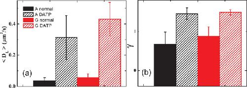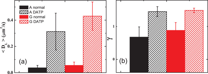 FIGURE 8:. (a) Changes of the mean value of the long-time diffusion coefficient DL for GM1s (black bars) and AChRs (red bars) after ATP depletion (DATP). (b) Changes of the mean value of the mobile ratio γ for GM1s (black bars) and AChRs (red bars) after DATP. The statistics of all the data sets for GM1s in a and b were obtained from 30 ATP-depleted cells in three separate experiments and those for AChRs were obtained from 40 ATP-depleted cells in three separate experiments. The error bars indicate the SD of the measurements. The effect of ATP depletion is shown with the shaded bars in comparison with the data from the untreated (normal) cells shown in solid bars. |