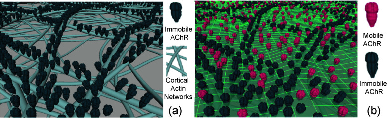 FIGURE 1:. Explanation of the dynamic picket-fence model. (a) Cortical actin network with anchored proteins (blue), which form a continuous random network, partitioning the membrane into corrals of different sizes. (b) The motion of mobile proteins (red) is confined to corrals, whose lift time is determined by the slow dynamics of the cortical network. As a result, the diffusion of the mobile proteins is strongly influenced by the size of the corrals, giving rise to a broad distribution of the local diffusion coefficient δ. |