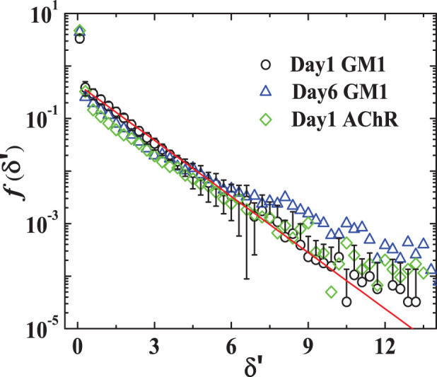 FIGURE 7:. Measured PDF f (δâ²) of the normalized diffusion coefficient δⲠ= δ/DL for the mobile GM1 trajectories. The data are obtained from two groups of 10 cells each cultured for 1 day (black circles) and 6 days (blue triangles), respectively. The green diamonds are obtained from the mobile AChR trajectories taken from a group of 10 cells cultured for 1day. The error bars indicate the SD of the black circles averaged over 10 cells. The red solid line is an exponential fit to the black circles, f (δâ²) â 0.45 exp (â0.82δâ²). |