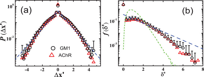 FIGURE 9:. (a) Measured PDF P ( Îxâ²) of the normalized displacement Îxâ² (Ï) with Ï = 4 s for the mobile trajectories of GM1s (black circles) and AChRs (red triangles) after ATP depletion (DATP). The blue dashed line indicates the exponential fit, P ( Îxâ²) â 0.53 exp (â1.26|xâ²|), to the black circles shown in Figure 6. (b) Measured PDF f (δâ²) of the normalized instantaneous diffusion coefficient δⲠ= δ/DL for the mobile trajectories of GM1s (black circles) and AChRs (red triangles) after DATP. The blue dashed line indicates the exponential fit, f (δâ²) â 0.45 exp (â0.82δâ²), to the black circles shown in Figure 7. The green dashed line shows the measured f (δâ²) for the silica spheres undergoing normal Brownian diffusion. The statistics of all the data sets for GM1s in a and b were obtained from 30 ATP-depleted cells in three separate experiments and those for AChRs were obtained from 40 ATP-depleted cells in three separate experiments. All the cells used were cultured within the first two days. The error bars show the SD of the measurement for the black circles. |