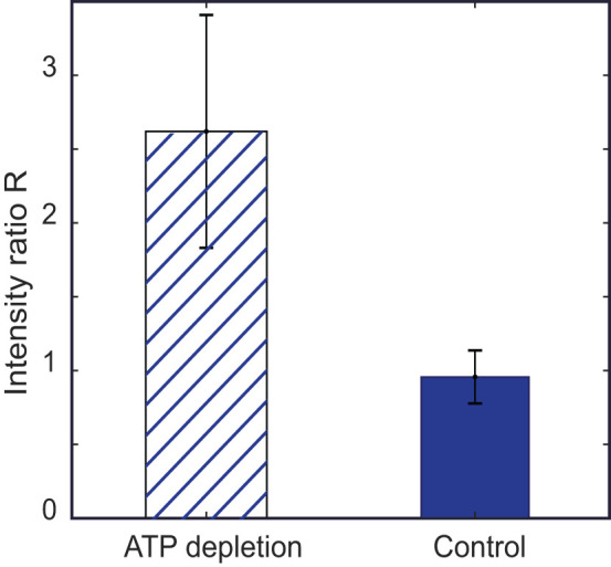 FIGURE 11:. Changes in the measured fluorescent intensity ratio R after the ATP depletion. The value of R is averaged over different parts of 20 muscle cells for both the ATP-depleted and control cell sets. Sixty data points are used in the statistics under each condition. The error bars show the SD of the measurements. |