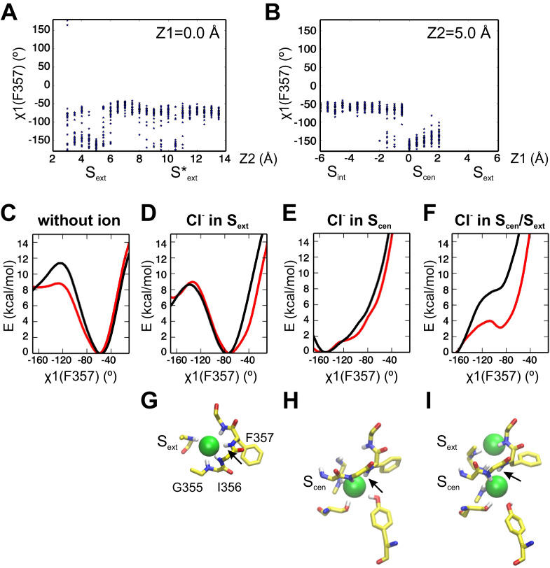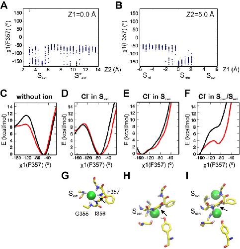 Figure 2—figure supplement 1. Ion binding influences the conformation of the F357 side chain.(A, B) The conformational sampling underlying the PMF of Figure 2A reveals large fluctuations of F357 χ1 angle when a Cl- visits the Scen binding site. The Scen/Sext doubly occupied state correspond to the coordinate (Z1, Z2)=(0.0, 5.0). The distribution of F357 χ1 values is plotted for each simulation window along the axes Z1 = 0.0 Å (A) and Z2 = 5.0 Å (B). (C–F) The PMF along F357 χ1 angle is shown for different occupancy states: in absence of ions (C), with a Cl- in Sext (D) or Scen (E), and with Cl- in both Scen and Sext (F). The PMF calculations were initiated with the F357 side chain in the up state (χ1=-160°, black) or the down state (χ1=-70°, red). (G–I) Molecular representations of the coordination scheme for ions in Sext (G), Scen (H), and Scen/Sext (I). The structures correspond to the free energy minimum of the PMF in panel (D), (E) and (F), respectively. The backbone conformation of residues I356 and F357 responds to the ion occupancy state, impacting on the preferred conformer of the F357 side chain. The black arrow indicates the NH group of F357. |