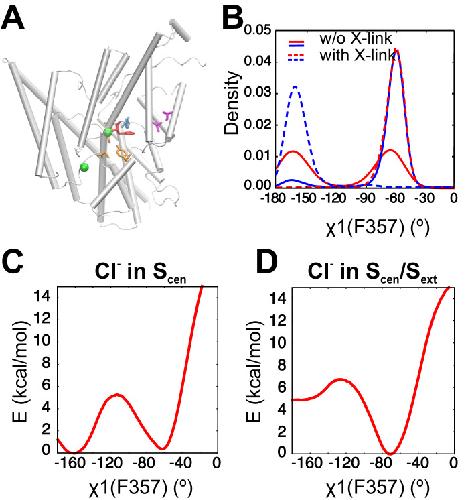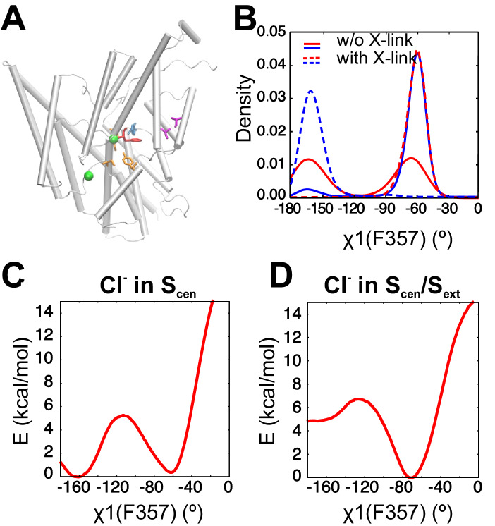 Figure 2âfigure supplement 2. A crosslink known to reduce transport activity impedes the reorientation of the F357 side chain.(A) Molecular graphic shows the position of the engineered crosslink within a CLC-ec1 monomer with the A399C-A432C crosslink in magenta sticks, the Cl- coordinating residues (S107, E148 and Y445) in orange sticks, Phecen (F357) and Phex (F190) respectively as red and blue sticks, and Cl- ions as green spheres. For clarity, residues 250 to 285 are not shown. (B) The distribution of F357 Ï1 angle is shown for simulations in absence and presence of the engineered crosslink. Two independent simulations are shown for each case. In presence of the crosslink, no transition is observed between the two rotameric states of F357. (C, D) The PMFs along F357 Ï1 angle shown in Figure 2âfigure supplement 1E,F are repeated here in presence of the crosslink, with a Cl- in Scen (C) and Cl- in both Scen and Sext (D). The PMF calculations were initiated with the F357 side chain in the down state (Ï1=-70°). The Cys bridge impedes the transition of F357 toward its up state (Ï1=-160°). |
