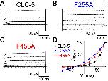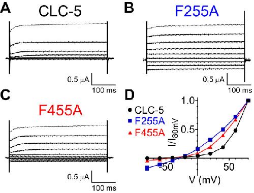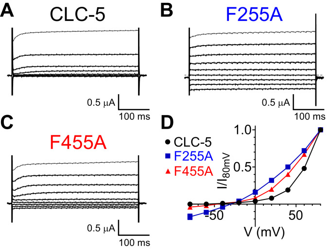 Figure 5—figure supplement 2. Phecen (F455) and Pheex (F255) regulate the voltage dependence of the CLC-5 exchanger.(A–C) TEVC current recordings of CLC-5 WT (A), F255A (B) and F455A (C). For voltage clamp protocol see Methods section. (D) Normalized steady state I-V relationship for CLC-5 WT (black circles, N = 25), F255A (blue squares, N = 10) and F455A (red triangles, N = 22). Values are reported as mean ± S.E.M, error bars are not shown where they are smaller than the symbol size. The raw data for the traces shown is available in Figure 5—figure supplement 2—source data 1.Figure 5—figure supplement 2—source data 1. Individual normalized data points. |