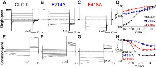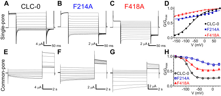 Figure 6. Phecen (F418) and Pheex (F214) contribute to voltage dependence of single- and common-pore gate of the CLC-0 channel.(A–C, E–G) Representative Two Electrode Voltage Clamp (TEVC) current recordings of CLC-0 WT (A, E), F214A (B, F) and F418A (C, G) evoked by single-pore (A-C) or common-pore (E-G) gating protocols (see Methods). (D, H) Normalized G-V relationships of the single- (D, filled symbols) and common-pore (H, empty symbols) gating processes of CLC-0 WT (black circles), F214A (blue squares) and F418A (red triangles). Solid lines represent fits to a Boltzmann function (Equation 1). Values are reported as mean ± S.E.M, error bars are not shown where they are smaller than the symbol size. Values for fit parameters and number of repeats for all conditions are reported in Supplementary file 1. The raw data for the traces shown is available in Figure 6—source data 1.Figure 6—source data 1. Individual data points. |