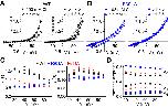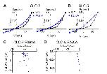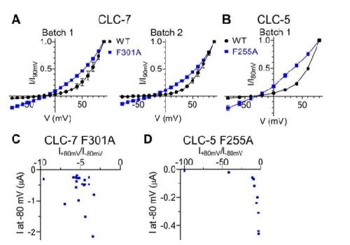 Author response image 1. Inward currents elicited by CLC-7 and CLC-5 Pheex mutants are not due to conductances endogenous to the expression system.Comparison of normalized I-V relationships of CLC-7 WT and F301A (A) as well as of CLC-5 WT and F255A (B) are shown for individual, independent batches of X. laevis oocytes. Endogenous conductances are assumed to be constant between WT and mutant injected oocytes within the same batch. No prominent inward currents were present in WT expressing oocytes, indicating that the inward currents are likely to be specific to Pheex mutants (CLC-7: N(WT, Batch 1)=5, N(F301A, Batch 1)=3, N(WT, Batch 2)=2, N(F301A, Batch 2)=2; CLC-5: N(WT)=2, N(F255A)=5). N refers to the number of individual oocytes. All values are reported as mean ± S.E.M, error bars are not shown where they are smaller than the symbol size. (C, D) For CLC-7 F301A (C; N=19) and CLC-5 F255A (D; N=10) no correlation was observed between the rectification index R=I+80mV/I-80mV and the current measured at -80 mV. |