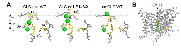 Figure 1. The anion pathway of the CLC Cl-/H+Â exchangers.(A) Close up view of the Cl- permeation pathway in three configurations: left, Gluex bound to Sext (CLC-ec1 WT; PDBID: 1OTS); center, protonated Gluex (mimicked by E148Q mutation) reaching out of the ion pathway (PDBID: 1OTU); right, Gluex bound to Scen (cmCLC WT, PDBID: 3ORG). Selected residues are shown as sticks and Cl- ions as green spheres. (B) The partially congruent Cl- and H+ pathways are shown in CLC-ec1 WT structure (Gluex and Gluin are shown in yellow, Cl- ions as green spheres). |