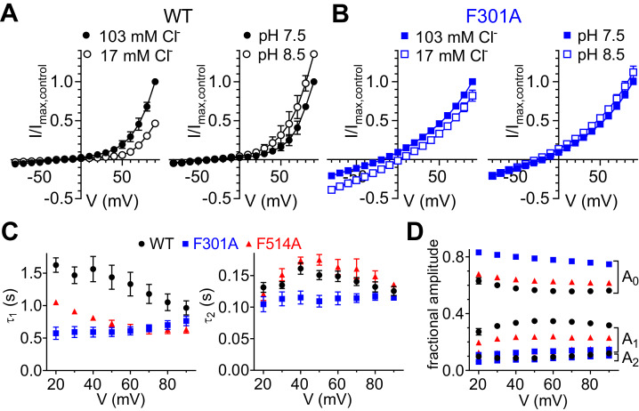 Figure 5—figure supplement 1. Impact of Phecen (F514) and Pheex (F301) mutagenesis on CLC-7 exchanger function.(A) Normalized I-V relationships of CLC-7 WT showing dependence on extracellular [Cl-] (left; N = 2) and [H+] (right; N = 2). (B) Normalized I-V relationships of CLC-7 F301A showing dependence on extracellular [Cl-] (left; N = 5) and [H+] (right; N = 5). (C, D) The time courses of current activation of CLC-7 WT (N = 8), F301A (N = 8) and F514A (N = 8) at voltages between +20 and +90 mV were fit to a biexponential function (see Materials and methods, Equation 2). (C) The slow (τ1, left) and fast (τ2, right) time constants of CLC-7 WT (black circles), F301A (blue squares) and F514A (red triangles) are plotted as a function of voltage. F301A strongly diminishes voltage dependence of both activation time constants (τ1, τ2; at every tested voltage p<0.05). F514A accelerates the slow time component τ1 (at every tested voltage p<0.005). (D) The fractional amplitudes A0, A1 and A2 for CLC-7 WT (black circles), F301A (blue squares) and F514A (red triangles) are plotted as a function of voltage. F301A increases the time-independent fractional amplitude A0 and decreases the contribution of time-dependent fractional amplitude A1 (at every voltage tested p<0.005). F514A increases A0 and decreases A1 (at every voltage tested p<0.005). All values are reported as mean ± S.E.M, error bars are not shown where they are smaller than the symbol size. The raw data for the traces shown is available in Figure 5—figure supplement 1—source data 1.Figure 5—figure supplement 1—source data 1. Individual raw data points. |