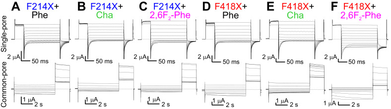 Figure 7—figure supplement 1. Effects of charge redistribution at Pheex and Phecen on the single- and common-pore gating processes of CLC-0.(A–F) Representative TEVC currents evoked with single- (top) and common-pore (bottom) gating protocols of the following CLC-0 variants: Pheex (F214X) replacements with Phe (A), Cha (B) or 2,6F2-Phe (C); Phecen (F418X) substitutions with Phe (D), Cha (E) or 2,6F2-Phe (F). |