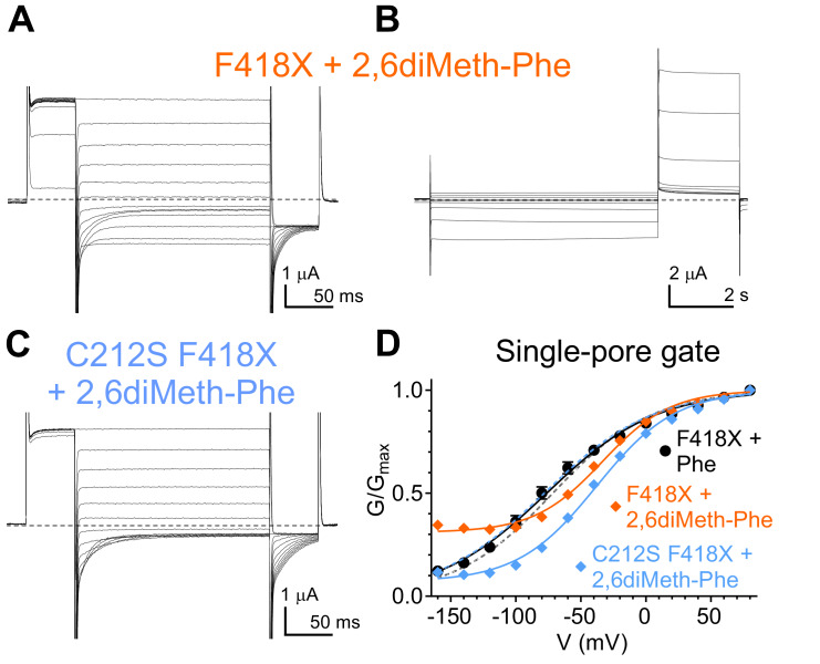 Figure 7—figure supplement 2. Effects of CLC-0 F418-2,6diMeth-Phe on single- and common-pore gating processes.(A–B) Representative TEVC currents of F418X+2,6diMeth-Phe evoked with single- (A) and common-pore (B) gating protocols, respectively. (C) Representative TEVC currents of C212S F418X+2,6diMeth-Phe evoked with the single-pore gating protocol. (D) Normalized G-V relationships of the single-pore gating processes of F418X+Phe (black circles; from Figure 7), F418X+2,6diMeth-Phe (orange diamonds) and C212S F418X+2,6diMeth-Phe (cyan diamonds; from Figure 7). Solid lines represent fits to a Boltzmann function with an offset (see Materials and methods, Equation 1). WT G-V curves (from Figure 6) are shown as gray dashed line for reference and C212S F418X+Phe G-V as cyan dashed line. Values are reported as mean ± S.E.M, error bars are not shown where they are smaller than the symbol size. Values for the fit parameters and number of repeats are reported in Supplementary file 1. The raw data for the traces shown is available in Figure 7—figure supplement 2—source data 1.Figure 7—figure supplement 2—source data 1. Individual data points. |
