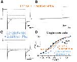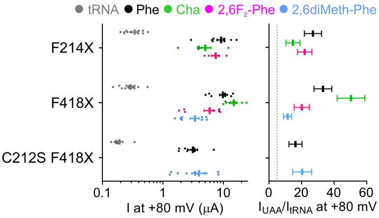 Figure 7âfigure supplement 3. Site-specific incorporation of non-canonical amino acids into CLC-0 channels is efficient and yields robust currents.(left panel) Mean current I at +80 mV in Xenopus laevis oocytes for F214X, F418X and C212S F418X CLC-0 co-injected with empty tRNA (gray) or tRNA misacylated with Phe (black), Cha (green), 2,6F2-Phe (pink) and 2,6diMeth-Phe (cyan). Individual data points are shown as circles and the mean ± S.E.M. is shown as a vertical bar with error bars. (right panel) For all constructs, IUAA/ItRNA was calculated from the means of IUAA and ItRNA at +80 mV as reported in the left panel. Errors were propagated. A threshold of IUAA/ItRNA >5 is imposed for specific incorporation efficiency (dashed line). The raw data is available in Figure 7âfigure supplement 3âsource data 1.Figure 7âfigure supplement 3âsource data 1. Individual data points. |