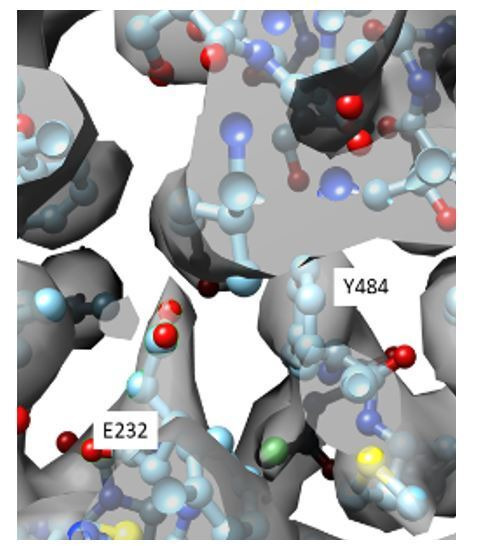 Author response image 2. Close up view of the density map (gray) in the CLC-1 pore allows placement of the E232 side chain (cyan, ball and stick). |