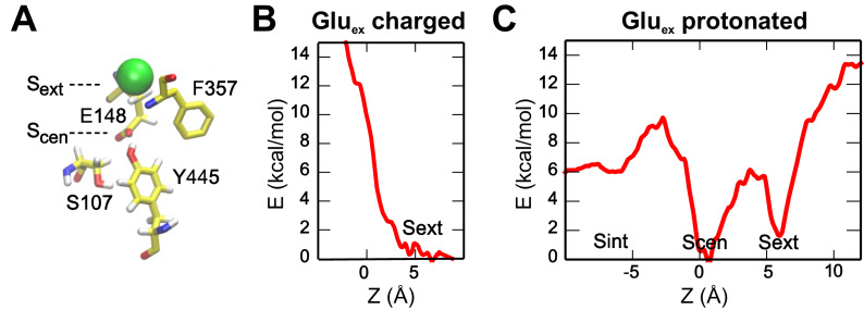 Figure 3—figure supplement 1. Binding of a Cl- to Sext and Scen with Gluex in the pore.(A) The molecular representation shows the initial state used for the PMF calculations. (B, C) The PMFs describe the entry of a Cl- into the pore when Gluex is charged (non-protonated) (B) or neutral (protonated) (C). The reaction coordinate is defined as in Figure 2. Scen and Sext binding sites are accessible only when Gluex is protonated, in agreement with the idea that Cl- and H+ binding happens simultaneously. The PMFs also show that Sint presents a lower binding affinity than Scen and Sext. |