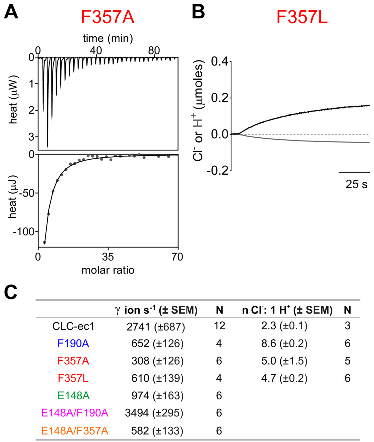 Figure 4—figure supplement 1. Effect of mutations on ion binding and transport in the CLC-ec1 exchanger.(A) Representative thermogram of Cl− binding to CLC-ec1 F357A. Top graphs show the heats released upon ion binding. Bottom graphs show the integrated heats (circles), and the solid line is the fit to a single-site isotherm with KD = 0.67 ± 0.02 mM; ΔH = −5.1 ± 0.3 kcal Mol−1, TΔS = −0.8 ± 0.3 kcal Mol−1, and n = 1 binding site, N = 2 independent repeats. (B) Representative time course of Cl- (black) and H+ (gray) transport recordings of purified CLC-ec1 F357L reconstituted into liposomes. (C) Summary table of transport rate and coupling stoichiometry for WT and mutant CLC-ec1. Numbers (N) of independent repeats of the flux measurements from at least two independent protein purifications. |