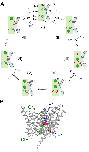 Figure 8. Proposed mechanism for the 2 Cl-: 1 H+ CLC exchangers.(A) Schematic representation of the 2 Cl-: 1 H+ CLC exchange cycle. The Cl- ions are shown as green circles and H+ as blue circles. The Cl- and H+ pathways are shown in pale green and cyan respectively. For clarity, the residues that undergo conformational rearrangements in each step are highlighted in red. The H+ pathway is shown as discontinuous when it is in a non-conductive conformation. (I) Apo- and occluded-state of the transporter with Gluex in Scen and Phecen in the up rotamer. (II) An intracellular Cl- ion binds to Sint. (III) The inner gate opens, a second intracellular Cl- binds so that both Sint and Scen are occupied and Gluex moves to Sext. (IV) The Cl- ions move to Scen and Sext, the inner gate closes, Gluex moves out of the pathway and becomes protonated. (V) Glu0ex interacts with Pheex. (VI) Glu0ex interacts with Phecen which rotates to the down conformation enabling the formation of a water wire connecting Glu0ex and Gluin; one Cl- ion is released from Sext and the other one moves from Scen to Sext. (VII) The H+ is transferred to Gluin favoring movement of Gluex into Scen and the Cl- ion in Sext is released to the extracellular solution, returning to the initial state (I). (B) Physically distinct Cl- and H+ pathways are indicated in CLC-ec1 WT structure (Gluex and Gluin are shown in yellow, Pheex in blue, Phecen in red, Cl- ions as green spheres). Both pathways converge at Gluex. |