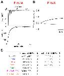 Figure 4. Phecen (F357) and Pheex (F190) determine the transport rate and Cl-/H+ coupling stoichiometry in CLC-ec1.(A–C) Representative time course of Cl- (black) and H+ (gray) transport recordings of purified CLC-ec1 WT (A), F190A (B) and F357A (C) reconstituted into liposomes. (D) Average transport stoichiometry of CLC-ec1 WT (black), F190A (blue) and F357A (red). (E) Representative time course of Cl- efflux from proteoliposomes reconstituted with CLC-ec1 WT (black), E148A (green), F190A (blue), F357A (red), E148A F190A (pink) and E148A F357A (orange). (F) Average Cl- transport rate of WT and mutant CLC-ec1. All values are shown as mean ± S.E.M. and reported together with the number of repeats (N) in Figure 4—figure supplement 1C. The raw data for the traces shown is available in Figure 4—source data 1.Figure 4—source data 1. Time course of the representative traces.Figure 4—figure supplement 1. Effect of mutations on ion binding and transport in the CLC-ec1 exchanger.(A) Representative thermogram of Cl− binding to CLC-ec1 F357A. Top graphs show the heats released upon ion binding. Bottom graphs show the integrated heats (circles), and the solid line is the fit to a single-site isotherm with KD = 0.67 ± 0.02 mM; ΔH = −5.1 ± 0.3 kcal Mol−1, TΔS = −0.8 ± 0.3 kcal Mol−1, and n = 1 binding site, N = 2 independent repeats. (B) Representative time course of Cl- (black) and H+ (gray) transport recordings of purified CLC-ec1 F357L reconstituted into liposomes. (C) Summary table of transport rate and coupling stoichiometry for WT and mutant CLC-ec1. Numbers (N) of independent repeats of the flux measurements from at least two independent protein purifications. |