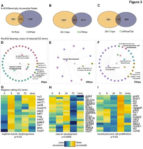 Figure 3. Differential accessibility analysis of pax6 libraries over regenerative time reveals chromatin accessibility prioritizes first tubule morphogenesis, followed by neural differentiation, and later proliferation. From left to right, data represents the 6hpa timepoint, 24hpa timepoint, and 72hpa timepoint. (A-C) Venn diagrams depicting number of unique and shared peaks called in each of the timepoint contrasts within the pax6 libraries. The intersect represents peaks that were both becoming accessible at a given timepoint, then losing accessibility. The green number in each contrast represents the timepoint that is more accessible. (D-F) All regions represented in (A-C) were used for GO:BP analysis with gProfileR2. ReviGO was then used to reduce redundancy in output GO terms and identify main families of terms. Tree graphs depict the hierarchy of reduced GO list. The central grey circle is the vertex of the graph representing the set of all GO terms included in the data, the second level of circles are the families of GO terms called by ReviGO, and the third level of circles represents GO terms in each family. Terms provided are the family names. (G-I) Heatmap of accessibility of regions that were used to call GO terms: âNephron Tubule Morphogenesisâ, âNeuron Differentiationâ, and âNeural Precursor Cell Proliferationâ. |