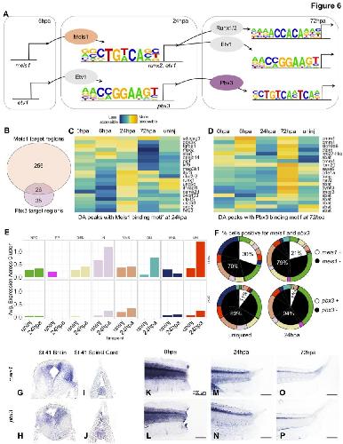 Figure 6. Gene regulatory network prediction identifies Meis1 and Pbx3 as key regulators of neural regeneration. (A) Predicted gene regulatory networks across regenerative time were derived from integrative analysis between ATAC-Seq and RNA- Seq data (See analysis in Methods). Meis1 and Pbx3 emerged as candidate regulators of regeneration. (B) Venn diagram showing the number of Meis1 and Pbx3 target regions found in differentially accessible regions of the chromatin. The overlap represents regions where both Meis1 and Pbx3 binding motifs were found. (C, D) Heatmaps showing accessibility of 20 differentially accessible regions of the chromatin identified with binding sites for (C) Meis1 or (D) Pbx3. (E) Average gene expression of meis1 and pbx3 in each neural cell cluster in the scRNA-Seq data in the uninjured and 24hpa timepoints. (Abbreviations: Neural Progenitor Cell (NPC), Differentiating Neuron(DiffN), Interneuron (IN), Vulnerable Motor Neuron (VMN), Dopaminergic Neuron (DN), Motor Neuron Leptin+ (MNL), Motor Neuron (MN)). (F) Sunburst diagram showing the percentage of neural cells that are either positive or negative for meis1 or pbx3 gene expression (inside) and the percentage of each neural cluster positive or negative for the genes (outside). (G-P) In situ hybridizations for meis1 and pbx3 in transverse sections of the head (G, H) and tail (I, J) at stage 41. In situ hybridizations for meis1 and pbx3 at (K, L) 0hpa, (M, N) 24hpa, and (O, P) 72hpa. |