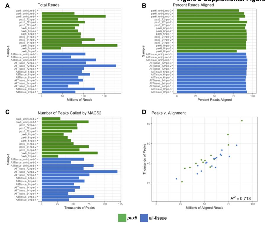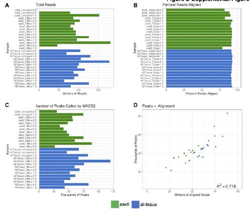 Supplement figure 2. Low input ATAC-Seq libraries meet sufficient quality for downstream analysis. (a) Barplot of total number of reads sequenced for each library. (b) Barplot of the percent reads aligned to the genome by Bowtie2 (c) Barplot of the number of peaks called from aligned reads by MACS2. (d) Correlation plot of number of aligned reads to number of called peaks. Reads and peaks aligns with correlation coefficient of r2=0.785. |