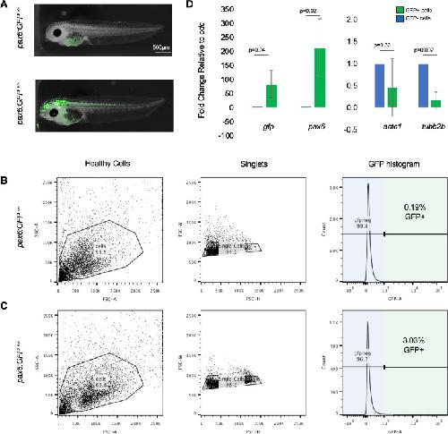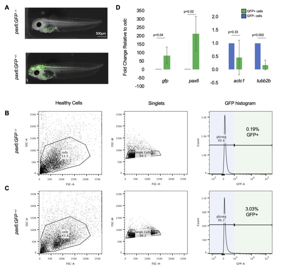 Figure 1—figure supplement 1. FACS gating was set using wild-type tadpoles to avoid false-positive GFP+ cells.(A) Representative images of stage 41 (top) wild-type tadpoles and (bottom) Xtr.Tg(pax6:GFP) tadpoles. (B) Representative gating for wild-type tadpoles. Gates were drawn to exclude all cells in the wild-type sample from being part of GFP signal. This gate setting was used to exclude autofluorescence from yolk in tadpole cells. The same gates from (B) were applied in (C) to collect pax6:GFP+ tadpole cells. Cells that fall within the gate represent true GFP+ signal. (D) qRT-PCR on GFP+ and GFP- cells from uninjured tails. GFP was used as a positive control, pax6 was used to assay for NPC marker, actc1 was used as a non-neural marker, and tubb2b was used as a differentiated neural marker. |